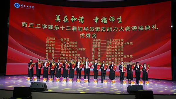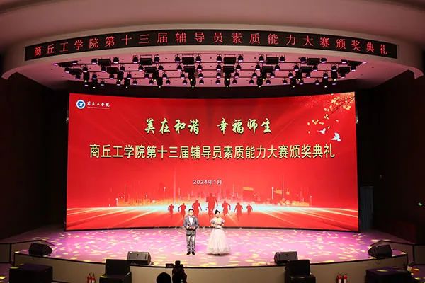 美在和谐,幸福师生。1月4日晚,商丘工学院第十三届辅导员素质能力大赛颁奖典礼在仓颉书苑报告厅举行。党委书记石培哲、党委副书记王峰,校长助理王保起、张文彩,相关职能处室负责人,各二级学院党总支书记、副书记、分团委书记、辅导员和学生代表一起观看了颁奖典礼。典礼由孔德刚和王思晴两位老师主持。