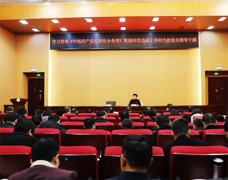 姜彦玲以《认真学习贯彻<中国共产党纪律处分条例> 做新时代忠诚干净担当的党员领导干部》为题,从《条例》修订的发展历程、修订的主要内容和学习贯彻的认识与思考进行了深入解读,并倡导广大党员干部要筑牢忠诚之心、强化担当之责、永保清白之身,严格执行《条例》,扛稳监督管理的责任,加强经常性的纪律教育,凝聚干事创业的精气神,挺起担当作为的硬脊梁,在新时代新征程上作出新贡献。