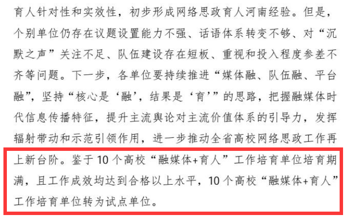 1月29日,河南省教育厅发布了《中共河南省委教育工委办公室 河南省教育厅办公室关于全省高校“融媒体+育人”工作试点(培育)单位、思政名师工作室中期质量监测情况的通报》(教思政函〔2024〕44 号),通报全省高校“融媒体 +育人”工作试点 (培育)单位、思政名师工作室建设中期质量监测会结果。郑州工程技术学院全省高校“融媒体+育人”工作培育单位培育期满,经质量监测,工作成效达到合格以上水平,成功转为试点单位,获批配套经费4万元。