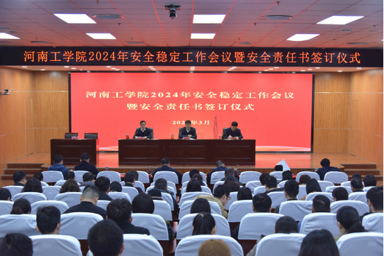为全面加强校园安全稳定工作,3月19日上午,河南工学院召开2024年安全稳定工作会议暨责任书签订仪式。校党委书记、校长陈丙义,副校长郑先锋,各二级学院、党政、教辅部门负责人及全体辅导员参加会议,会议由党委副书记、工会主席李贵敏主持。
