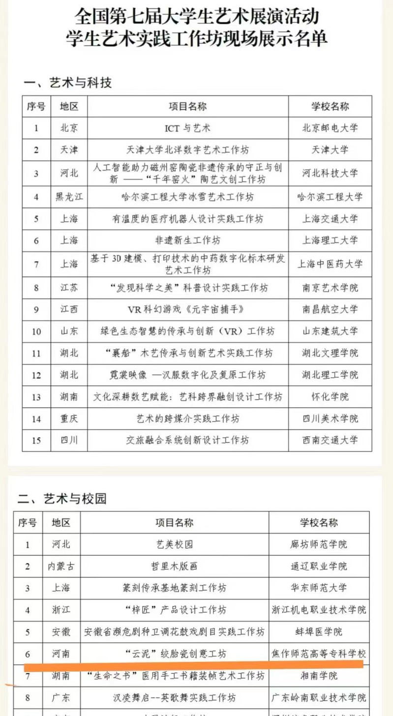 近日,全国第七届大学生艺术展演入围名单公布,焦作师范高等专科学校学生“云泥”绞胎瓷创意工坊入围学生艺术实践工作坊现场展示。大学生艺术展演活动由教育部主办,每三年一届,是我国规格最高、规模最大、影响最广的大学生艺术盛会。展演活动分为高校开展活动、省级集中展演和全国现场展演三个阶段开展,展演活动包括艺术表演类(含集体项目和个人项目)、学生艺术实践工作坊、艺术作品类(含学生艺术作品和高校校长书画摄影作品)和高校美育改革创新优秀案例四大类。在河南省第七届大学生艺术展演中,学校荣获一等奖8项、二等奖5项,三等奖4项,其中,美术学院推送的大学生艺术实践工作坊作为唯一一个专科学校进入省级展演活动现场,经过专家评审,代表河南省入围全国大学生艺术实践工作坊现场展示。