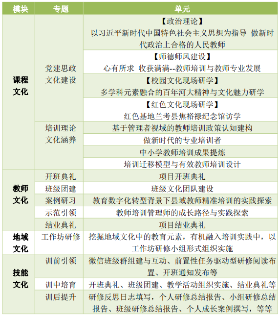 2.教师文化模块包括项目开班典礼、班级文化团队建设、培训管理示范引领和项目结业典礼。