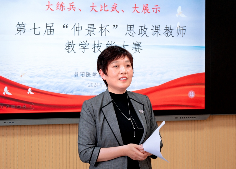 校长范真为大赛致辞。她强调,思政课是高校教育的核心,承载着“立德树人”“铸魂育人”的神圣使命。本次大赛是落实学习宣传贯彻党的二十大精神,推动习近平新时代中国特色社会主义思想“三进”工作的重要举措,同时也是学校党委“1233”工作的重要内容,是“铸魂育人”工程的重要部分,体现了校党委、校行政对思政课建设、提升教学质量的高度重视。学校连续七年举办“仲景杯”思政课教师教学技能大赛,使思政课教师快速成长,高质量完成了学校思政课的教育教学任务。大赛使教师们的教学内容更加充实,现代教学手段运用更加娴熟,能够有效提高思政课教学质量,达到“启智润心”的教育效果。她希望各位教师要把本次比赛作为新的起点,持续提高授课水平,使党的创新理论真正进课堂,达到入耳入脑入心的教学效果。