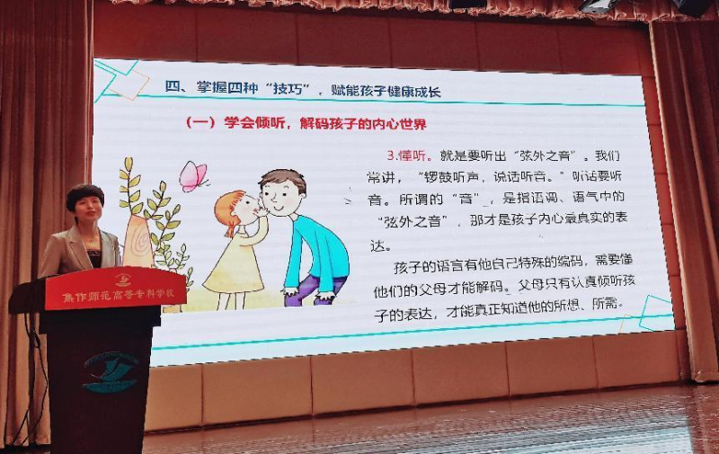 高闰青的讲座主要包括四个方面内容:一是补充三种“元素”,滋养孩子心理成长:二是拆掉四堵“心墙”,架起亲子沟通桥梁;三是讲好三句“情话”,构建良好亲子关系;四是掌握四种“技巧”,赋能孩子健康成长。既有实用的理论指导,又有可操作的亲子沟通技巧、方法。培训会现场气氛热烈,互动积极,频频响起热烈的掌声。