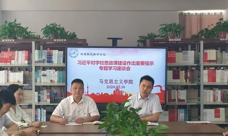 5月14日下午,河南物流职业学院马克思主义学院在平原校区图书馆会议室召开了习近平总书记对学校思政课建设作出重要指示专题学习座谈会。马克思主义学院党支部书记李金波、院长娄振平共同主持座谈会并参与研讨,一校三区全体思政课教师参加座谈会。