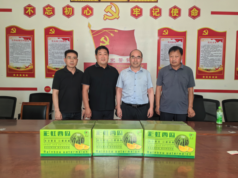 中午,工作队一行到扶沟县刘村查看了西瓜大棚。大棚里种植的是刘村合作社新品种彩虹西瓜,西瓜绿皮黄心,体小脆甜,销路很好,特别是采用了郑州工程技术学院师生设计的外包装箱,提高了该西瓜的品牌形象,得到了市场好评。村党支部书记董铁山对学校大力帮扶表示了感谢,双方就该村合作社的其他产品销售进行了商谈。