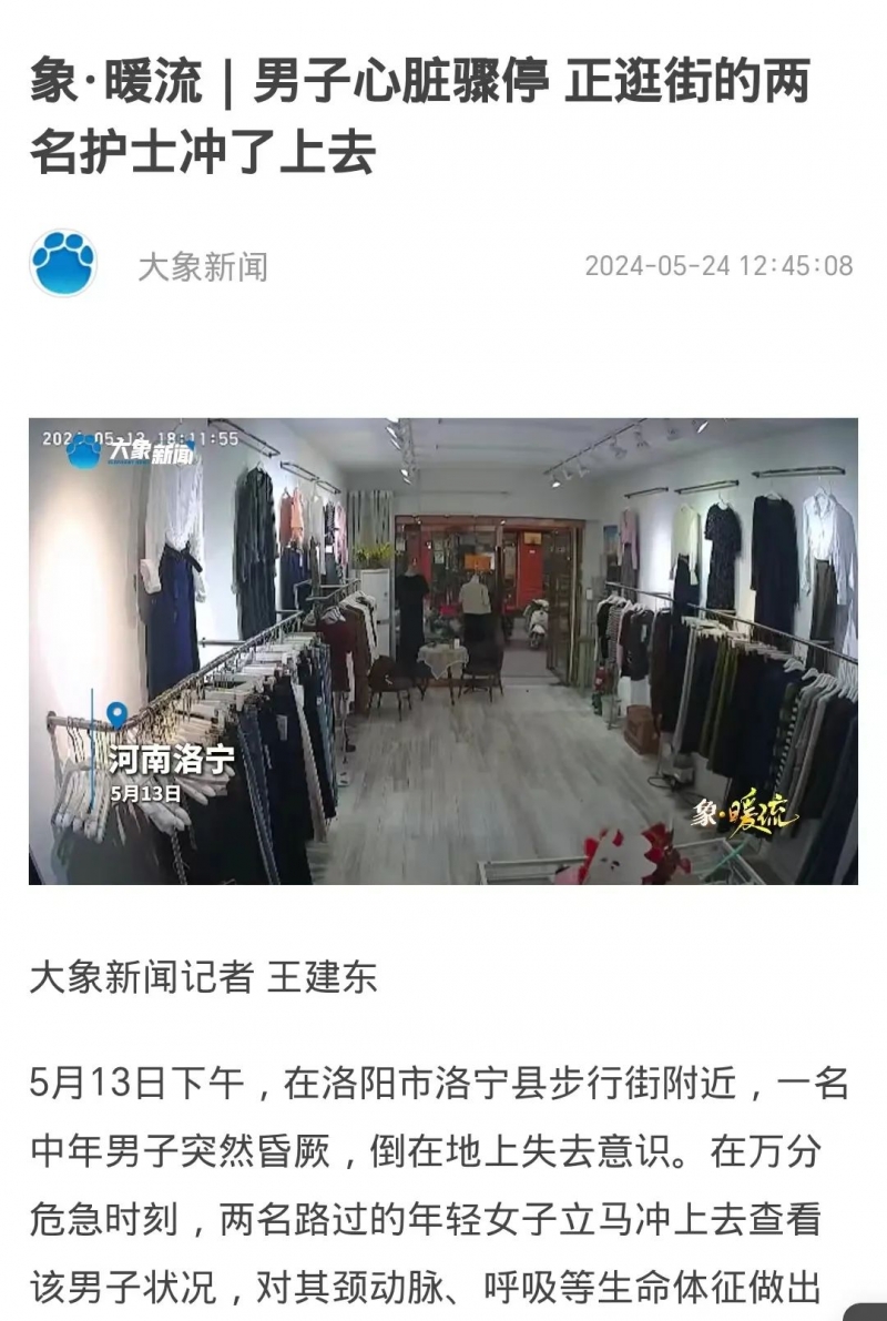 5月13日下午,李芳芳和同事程盈盈正在洛宁县步行街散步,路过一家服装店时,看到店主党女士神色慌张地向对面商户求助,让其帮忙拨打120急救电话,在得知党女士丈夫突发心搏骤停倒在二楼时,李芳芳和程盈盈第一时间冲了上去。