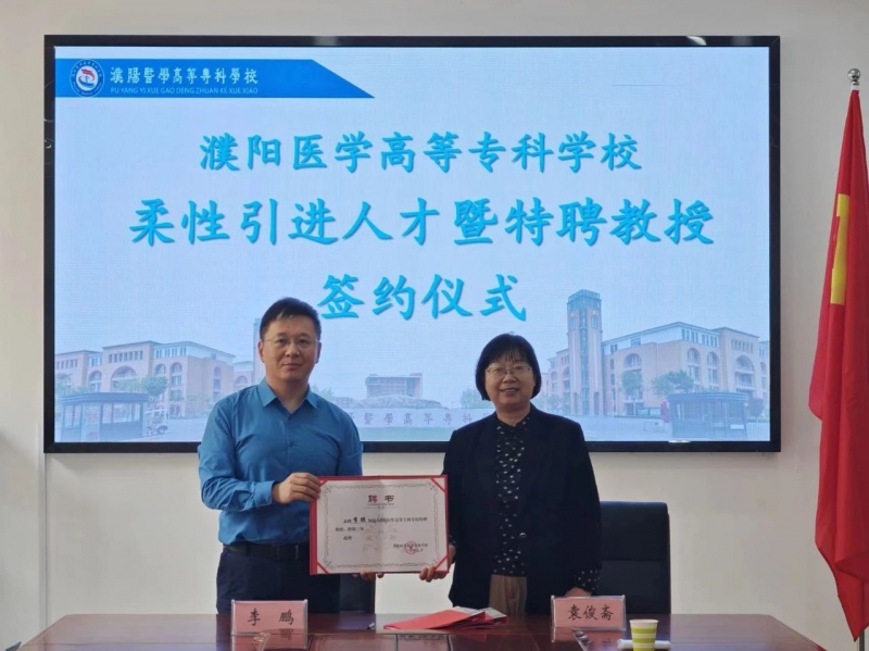 5月24日上午,濮阳医学高等专科学校举行柔性引进人才暨特聘教授签约仪式,聘任河南省医学杰青、河南省教育厅学术技术带头人、青年骨干教师、硕士生导师李鹏博士为公共卫生学院特聘教授。副校长袁俊斋出席仪式。公共卫生学院、科研处相关人员参加。