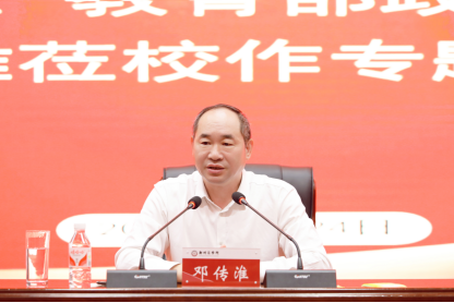 报报告中,邓传淮重点围绕“九个坚持”、教育的根本问题、全面贯彻党的教育方针、加快建设教育强国、弘扬和践行教育家精神等,深入阐释了习近平总书记关于教育的重要论述的丰富内涵和核心要义。邓传淮还结合自身工作经历,就如何做一名忠诚、干净、担当的好干部,如何更好地为学、为事、为人,分享了人生感悟。