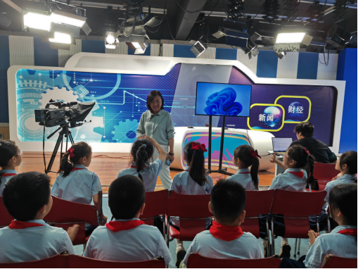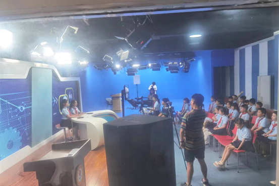 在活动现场,信阳职业技术学院语言与传媒学院学生党支部优秀党员带领小学生们参观了融媒中心演播厅,了解了广播电视节目的制作流程。