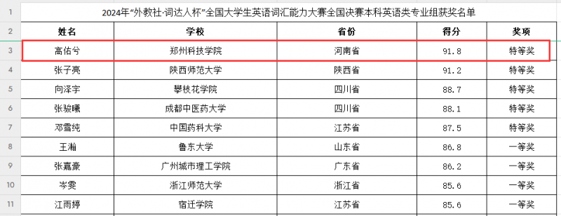 6月5日,从郑州科技学院传来喜讯,该校外国语学院大学生高佑兮,在第四届“外教社·词达人杯”全国大学生英语词汇能力大赛总决赛中,经过激烈的角逐,凭借扎实的英语词汇基础和卓越的表现力,成功摘得全国总决赛特等奖的桂冠。