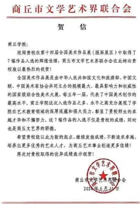 全国美术作品展览简称全国美展是中国美术界最权威、规模最大的顶级展览,也是独特的国家艺术评价体系。它由文化部、文学艺术界联合会和美术家协会联合主办。全国美展代表着社会的主流意识和审美评判,具有政府的话语权和鲜明的政策导向性。商丘学院在此次参展中成功入选7幅作品,在河南省高校中入选数量排名第一,商丘市文学艺术界联合会获悉商丘学院在第十四届全国美展上取得的佳绩,特向商丘学院发来贺信!