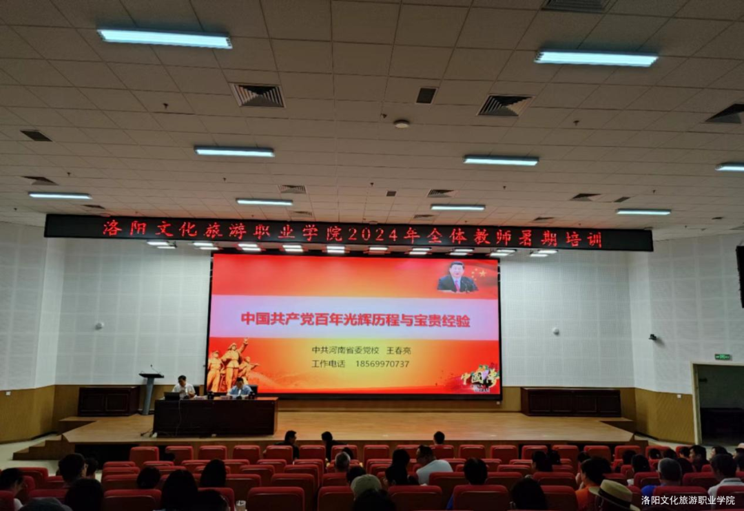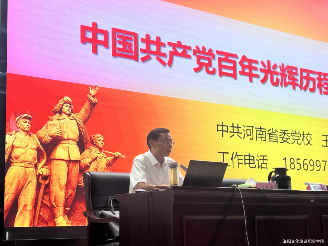为加强学校骨干教师和全体党员队伍政治思想建设,加强教师队伍发展和提升人才培养质量,提高骨干教师思想站位、坚定教育初心、开阔学术视野和精进专业理论,进一步夯实基层组织基础,提升党组织建设水平和学校党员队伍的整体素质,增强学校党员带头干实事和带领同志们奋力谋生存、促发展的先锋模范作用,推动学校各项工作有目的、有计划、有步骤、有手段的稳步前行。7月1日下午,洛阳文化旅游职业学院特邀请中共河南省委党校党史部王春亮博士、副教授在伊滨区一楼报告厅作“中国共产党百年光辉历程与宝贵经验”专题讲座。全体教师共同参与,讲座由学校党委委员、副校长李春雷主持。