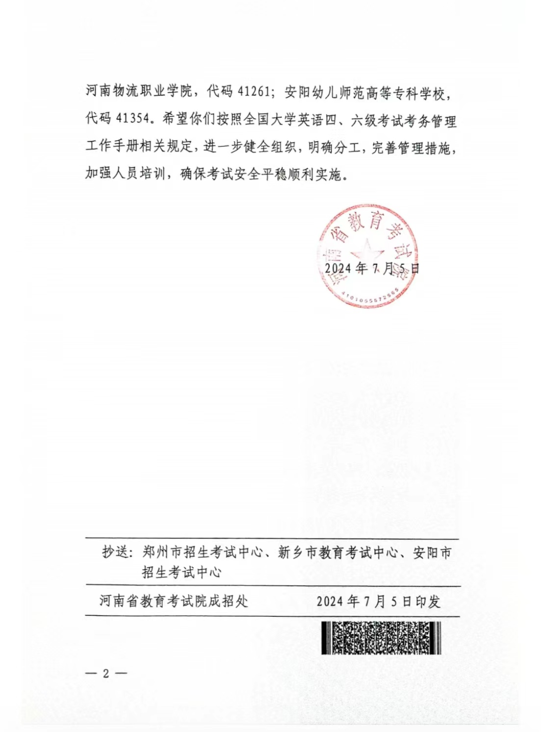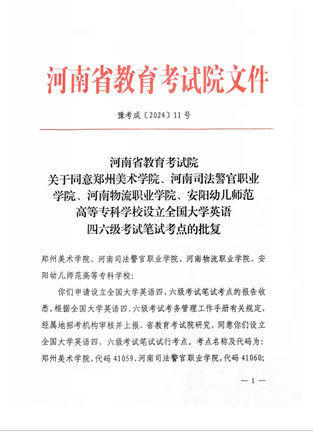 2024年7月5日,经河南省教育考试院批准,河南物流职业学院正式成为全国大学英语四、六级考试新增考点,考点代码:41261。从2024年下半年开始,河南物流职业学院将作为独立考点组织英语四六级考试。