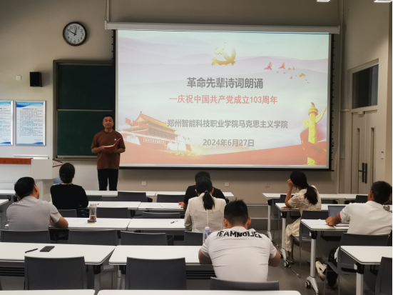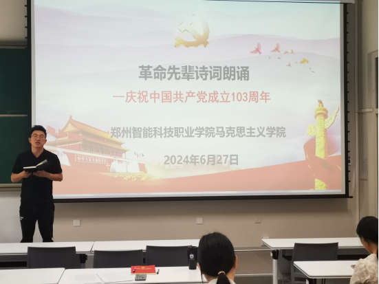 四是举行“革命先辈诗词朗诵会”, 为庆祝中国共产党成立103周年,弘扬伟大建党精神、赓续红色血脉、强化责任担当,6月27日上午,马院党支部在朝新楼104教室隆重举行了“革命先辈诗词朗诵会”。