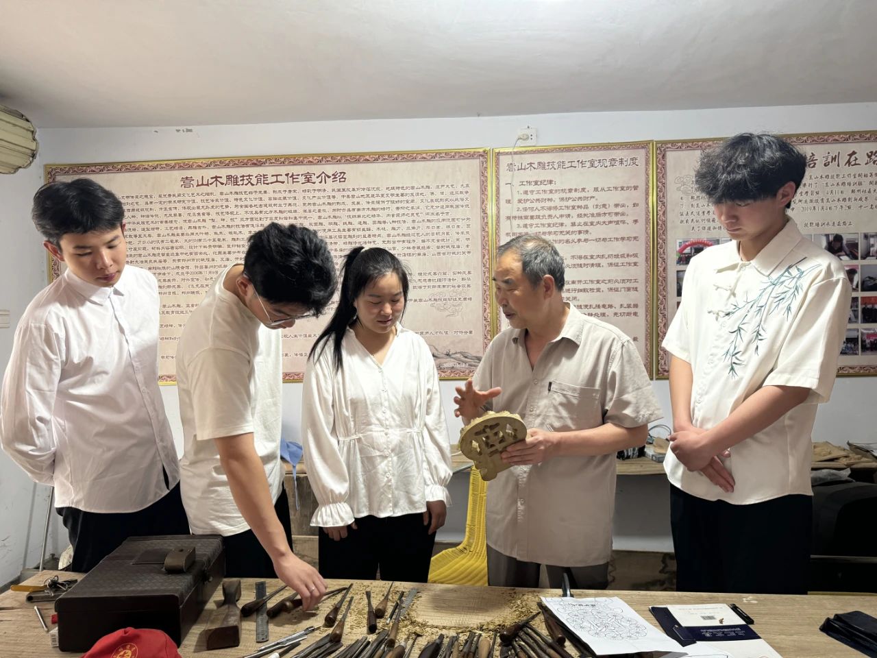 活动的最后一站,学生们走进了嵩山木雕艺术研究所及展示传习馆。在这里,他们见到了嵩山木雕代表性传承人王振北先生。王先生从嵩山木雕的历史渊源、制作技艺、文化内涵等方面为团队成员们进行了详细的讲解。他还带领大家参观了展示传习馆内的嵩山木雕手工艺精品和专用工具等器物,让大家近距离感受到了嵩山木雕的艺术魅力和文化价值。通过与非遗传承人的面对面交流,团队成员们更加深入地了解了非遗技艺的历史渊源和传承之道,增强了对传统文化的认同和热爱。
