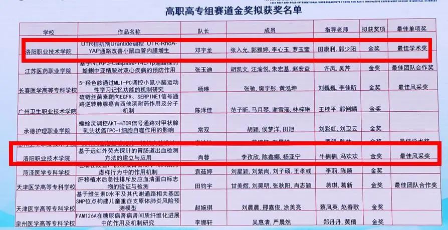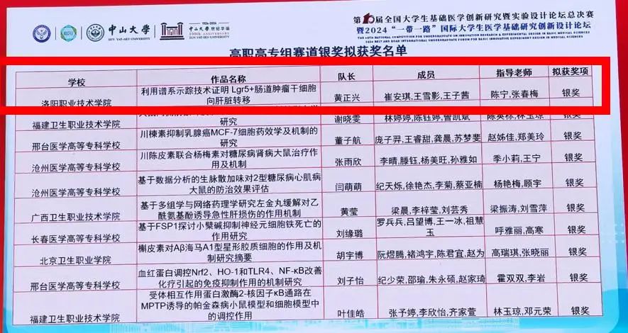 自赛事启动以来,洛阳职业技术学院高度重视、科学筹划、周密组织,基础医学院积极组建参赛队伍,并组织专家和指导教师对参赛项目进行指导,参赛师生积极备赛,对参赛项目进行反复打磨,精益求精。在总决赛中,基础医学院4支参赛队伍发挥出色,参赛师生凭借扎实的专业知识、创新的研究思路、出色的表达能力,赢得了评委们的高度认可,脱颖而出。最终,田康利和郭少阳团队获得金奖和最佳学术奖,牛楠楠和冯欢欢团队获得金奖和最佳风采奖,陈宁和张春梅团队获得银奖,蒙雪琼和张沂团队获得铜奖。