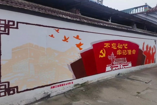 艺术设计学院墙绘实践活动是河南工业贸易职业学院校地结对帮扶工作重点特色品牌。8月22日至28日,“艺术赋能宁陵发展 美育助力文化振兴”主题墙绘实践团近30名师生赴宁陵县城郊乡王仪宾村,以青春之笔扮靓乡村“颜值”,绘就乡村振兴新画卷。师生们战酷暑斗蚊虫,在汗水淋漓中有条不紊地设计构图、调配颜色、描边勾线、绘图上色,共绘制了32幅墙面约300平米作品,一幅幅构图精美、积极向上的新画面覆盖了村落里斑驳的老砖墙,形成一面面靓丽的特色文化墙,为王仪宾村增添了别样色彩。