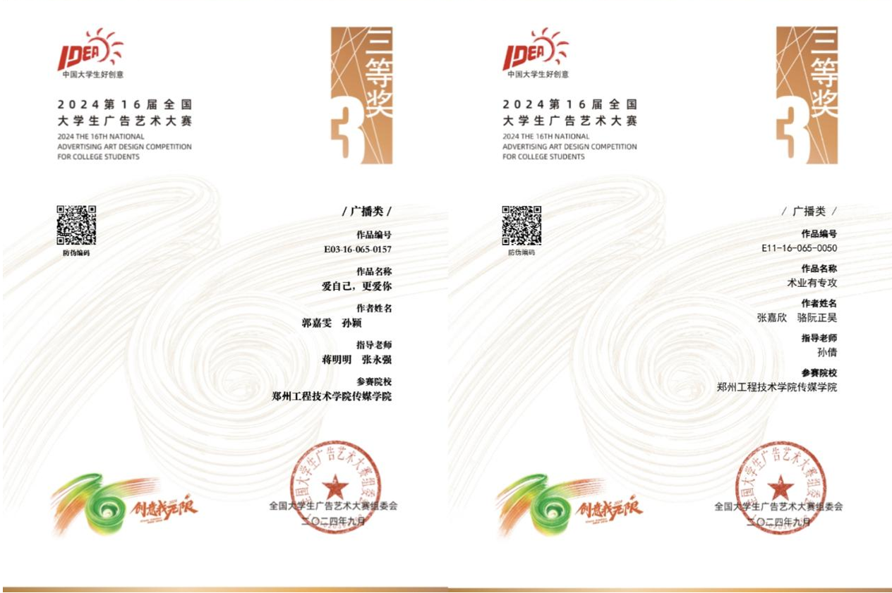 2024年9月6日,第16届全国大学生广告艺术大赛(以下简称大广赛)全国总评审获奖成绩公布,在此次大赛中,郑州工程技术学院传媒学院共斩获国赛奖项60项,包括一等奖1项、二等奖2项、三等奖13项、优秀奖44项。