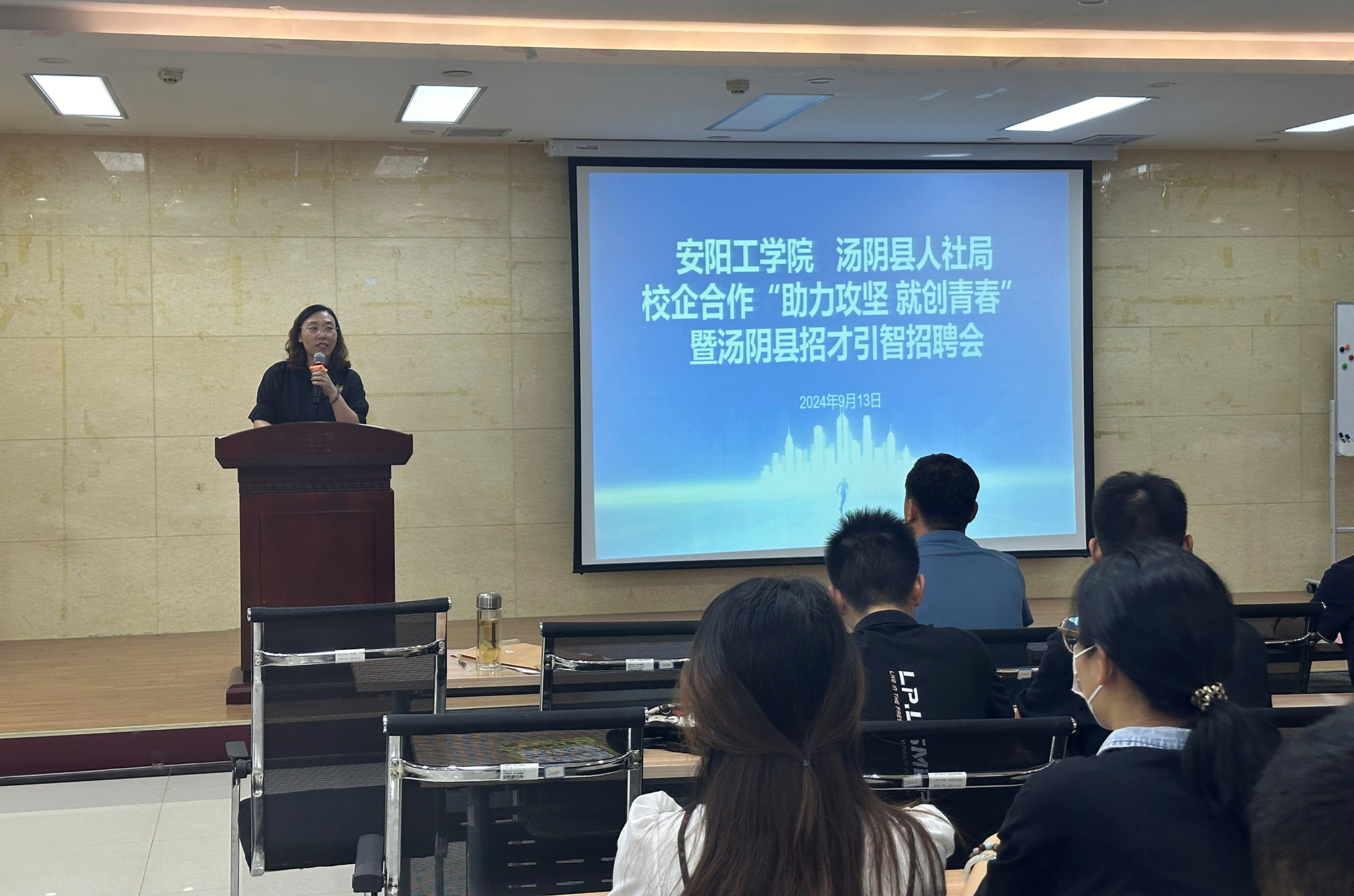 9月13日,安阳工学院与汤阴县人社局联合举办校企合作“助力攻坚 就创青春”暨汤阴县招才引智招聘会活动。汤阴县人社局党组成员、直属机关委员会书记燕景海,安阳工学院招生与就业指导处处长牛东亚出席活动。汤阴县优质企业代表、学校2025届师生代表共60余人参加活动。