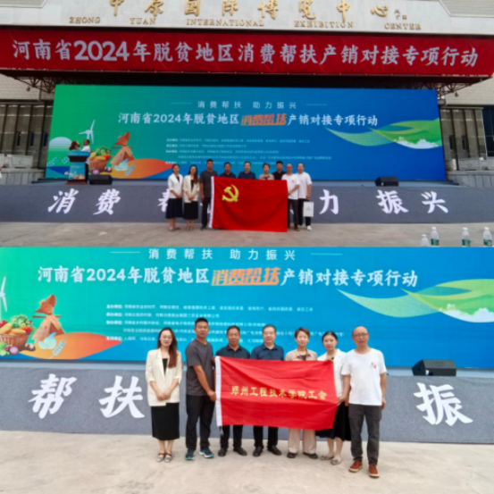 近日,河南省农业农村厅、河南省委直属机关工委、河南省发展改革委、河南省商务厅、河南省政府国资委、河南省总工会联合举办的河南省2024年脱贫地区消费帮扶产销对接专项行动在郑州市中原国际博览中心举行,消费帮扶是巩固拓展脱贫攻坚成果同乡村振兴有效衔接的重要举措,是增强脱贫地区和脱贫群众内生发展动力的有效途径。郑州工程技术学院高度重视此次产销对接专项行动,校党委委员、组织部部长李本带队,校工会、后勤服务中心、二级工会代表、驻村工作队一同参加。