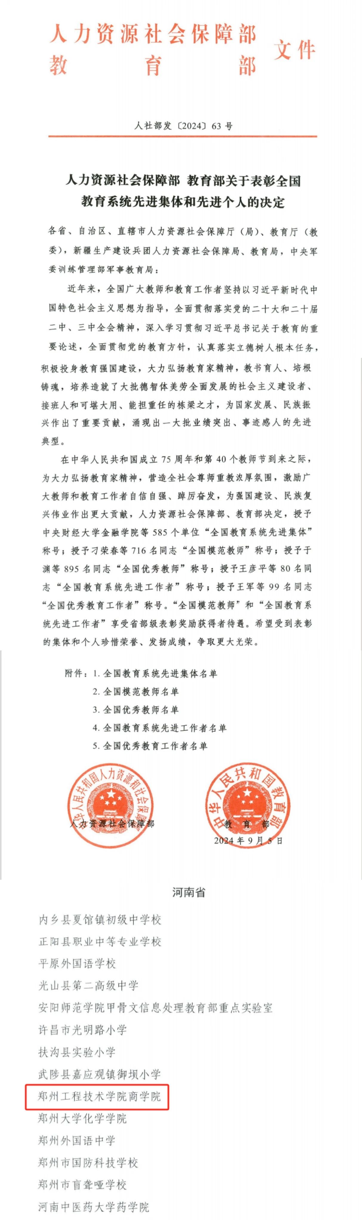 2024年9月8日,庆祝第40个教师节暨全国教育系统先进集体和先进个人表彰活动在北京举行,郑州工程技术学院商学院荣获“全国教育系统先进集体”荣誉称号。“全国教育系统先进集体”每五年评选一次,是全国教育系统内集体最高荣誉,也是我校首次获此殊荣。