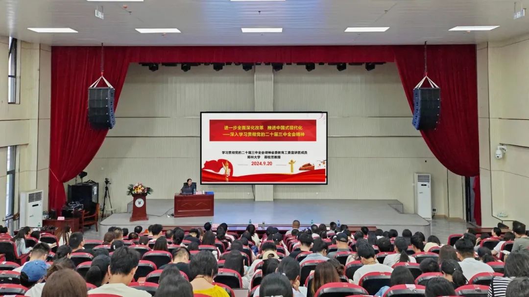 9月20日,学习贯彻党的二十届三中全会精神省委教育工委宣讲团成员、郑州大学马克思主义学院教授蒋桂芳,为郑州医药健康职业学院师生宣讲党的二十届三中全会精神。学校校领导、师生代表300余人聆听宣讲报告。宣讲会由校党委书记韩爱敏主持。