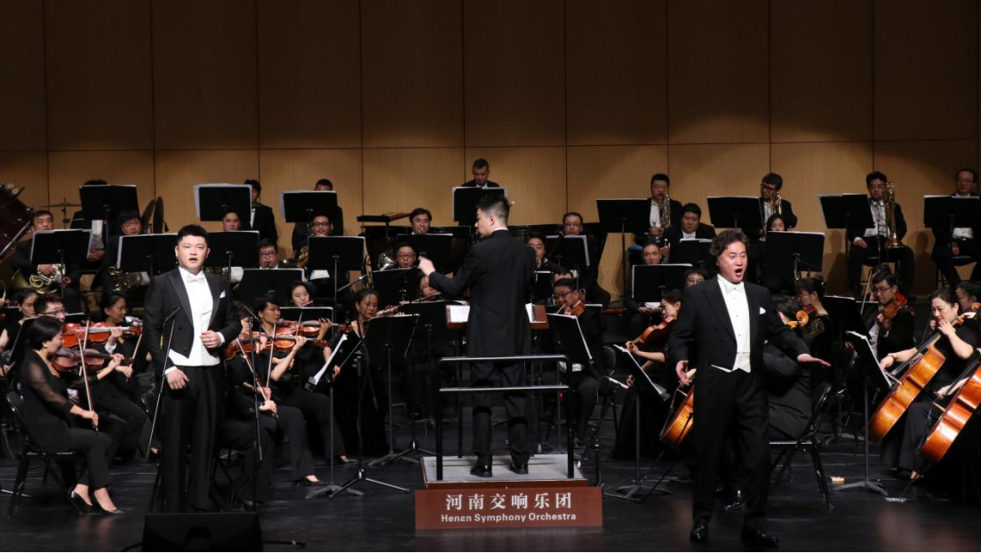 音乐会由青年指挥家柴昊夫执棒,在《我的祖国》优美的旋律中拉开序幕,陈静、李新现、黄慧慧以及学院青年教师张楠、林欢欢倾情献唱《沁园春·雪》《归来的星光》《老家河南》《把一切献给党》《黄河渔娘》等声乐作品,旋律回荡着民族情怀,以现代审美热情歌颂伟大祖国取得的辉煌成就;河南交响乐团演奏了《威廉退尔序曲》《卡门序曲》《帕拉迪奥》《电闪雷鸣波尔卡》《第九交响曲——第四乐章》《红旗颂》等经典曲目,音乐的旋律在中西方文化中碰撞激荡,迸发出艺术的共鸣,赢得现场观众阵阵掌声。音乐会在戴玉强院长演唱《在那遥远的地方》《我的太阳》经典旋律中推向高潮,舞台下,800名观众伴随歌声或齐声高唱,或安静聆听,台上台下汇聚成气势磅礴的“交响乐”。音乐会通过网络平台进行直播,在线观众36.66万人,进一步提升了学校的社会影响力和美誉度。