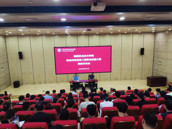 9月19日下午,鹤壁职业技术学院在海棠园校区1号报告厅召开参加河南省第三届职业技能大赛赛前动员会。学校各二级学院负责人、大赛裁判、指导教师及参赛选手参加了会议。学校党委委员、副校长杨长春出席会议并做了赛前动员讲话。会议由教务处处长侯铁兵主持。