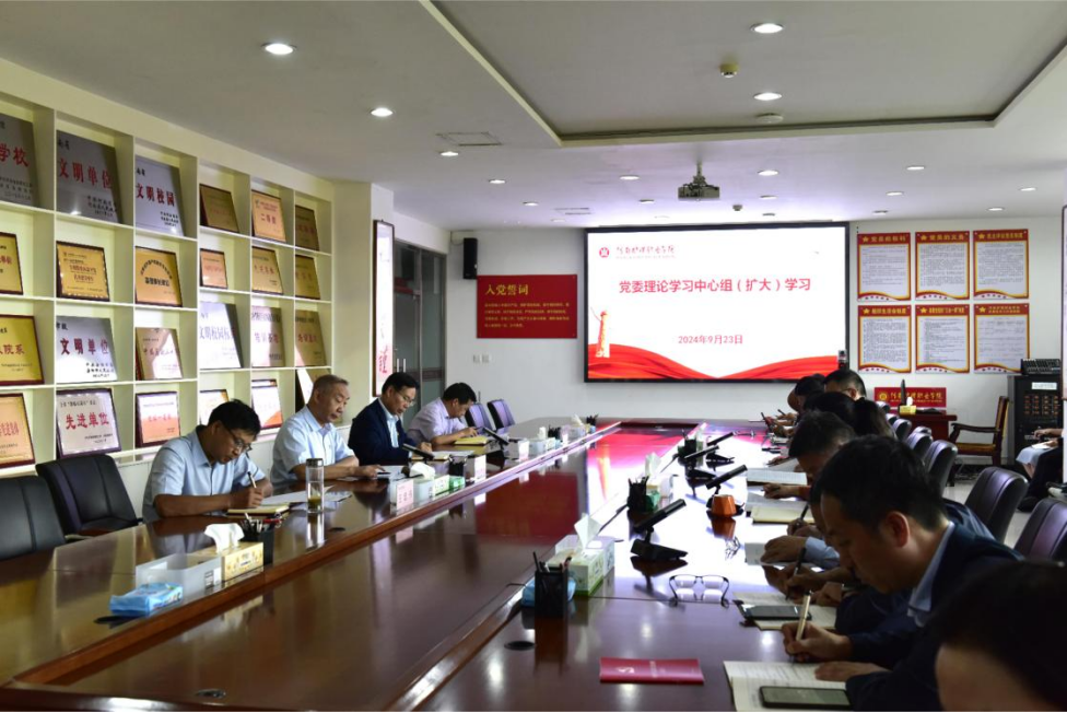 9月23日下午,河南护理职业学院党委理论学习中心组(扩大)学习会议在第一会议室召开,传达学习全国教育大会精神和全省教育大会精神。校领导班子成员、各党总支(直属党支部)书记、各部门负责人参加会议。会议由党委书记杜天信主持。