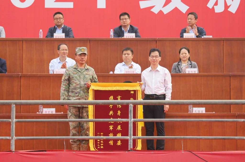 孔国庆代表全校师生向承训部队赠送锦旗。