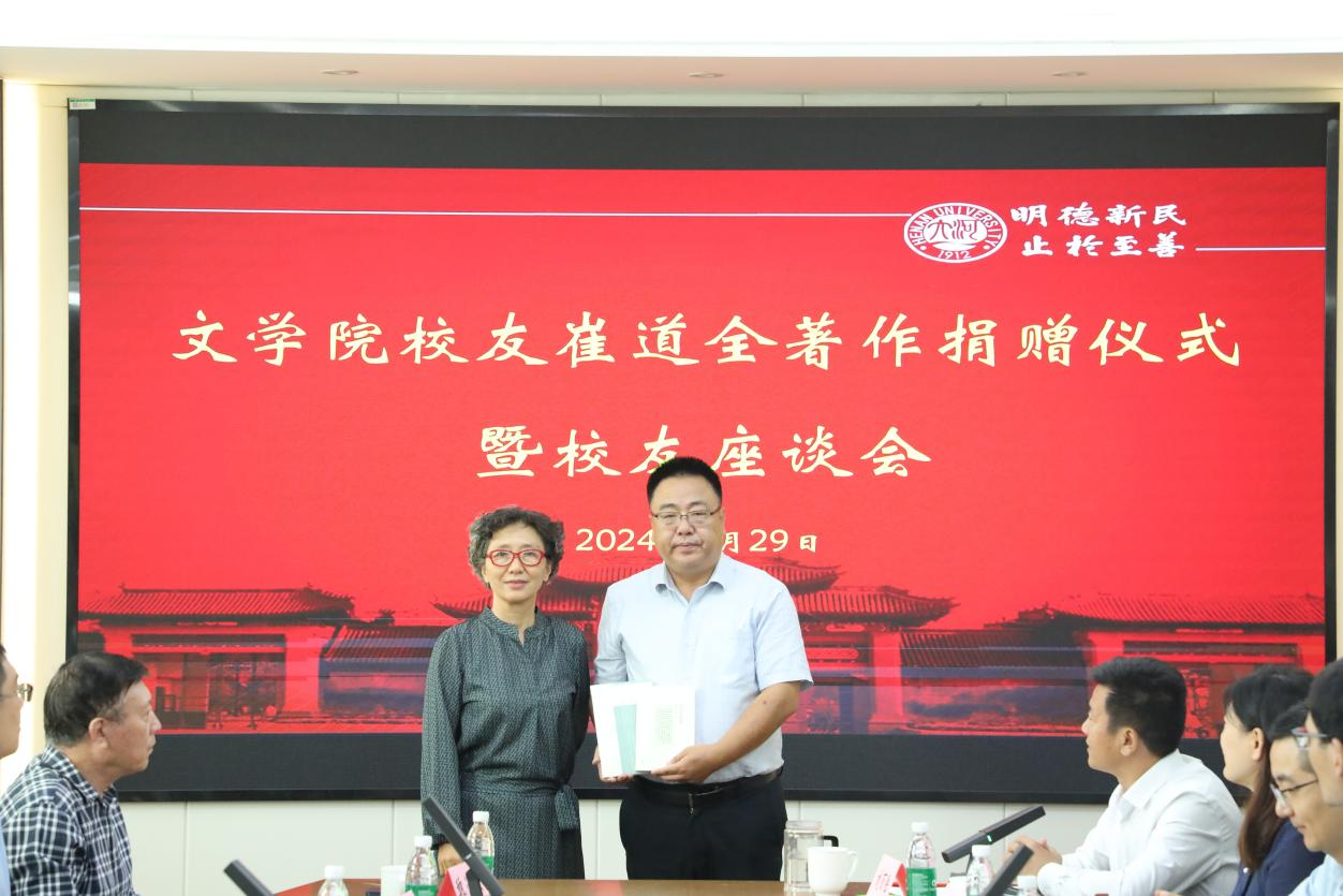 活动现场,90岁高龄的崔道全先生由于身体原因无法参加捐赠仪式。崔道全先生的女儿、河南教育报刊社党政办副主任崔君萍代表父亲崔道全向河南大学文学院捐赠著作《南北东西集》《诗品三国人物》。