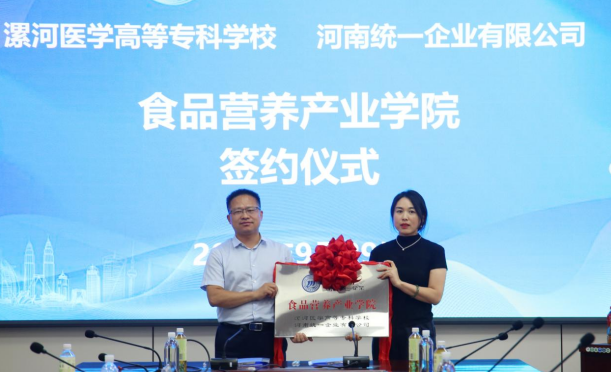 为推动食品营养领域产学研深度融合,9月29日,漯河医学高等专科学校与河南统一企业有限公司共建食品营养现代产业学院签约仪式在召陵校区举行。校党委委员、副校长马永超,河南统一企业有限公司人事总监胡布娜、品保课经理张智杰、人事经理裴雨及校工会、教务处、科研处、就业处及公共卫生与健康营养学院有关负责人、教师代表等参加签约仪式。仪式由公共卫生与健康营养学院院长宋兆华主持。