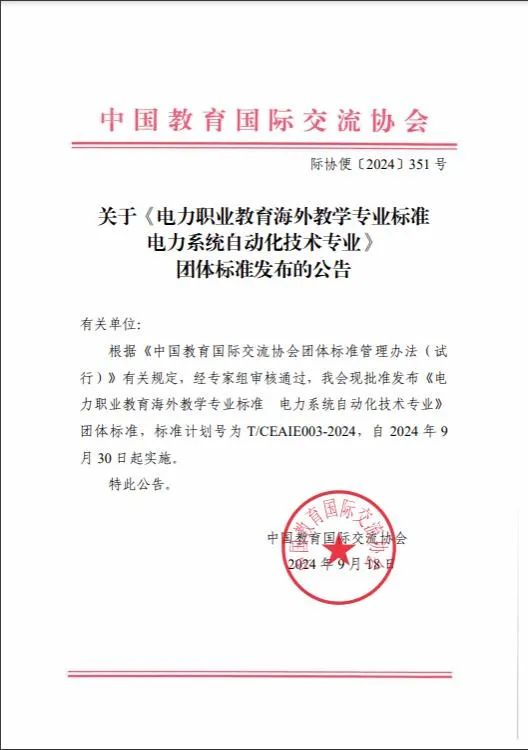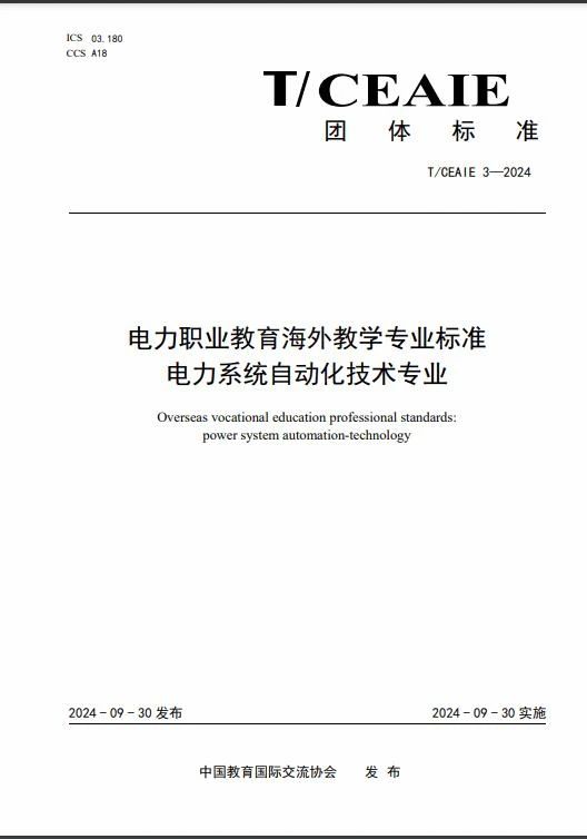 近日,郑州电力高等专科学校牵头制订的《电力职业教育海外教学专业标准--电力系统自动化技术专业团体标准》获中国教育国际交流协会批准发布,标准计划号为T/CEAIE003-2024,并于2024年9月30日起正式实施。