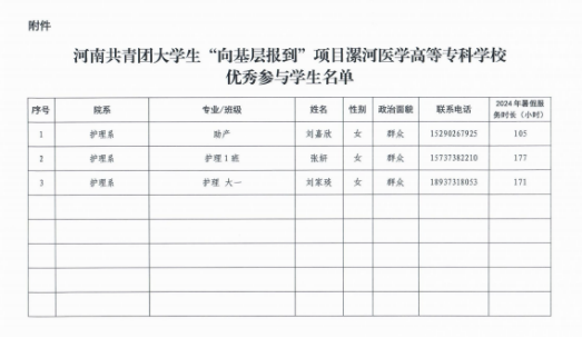 2024年暑假期间,漯河医学高等专科学校学生积极参与相关社会实践项目,在基层社会治理、乡村振兴、绿色发展等领域中勇于担当、甘于奉献,展现了新时代大学生良好的精神风貌,受到了团省委的肯定,其中刘嘉欣、张妍、刘家琰三名同学被团省委认定为优秀参与学生。