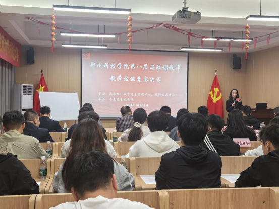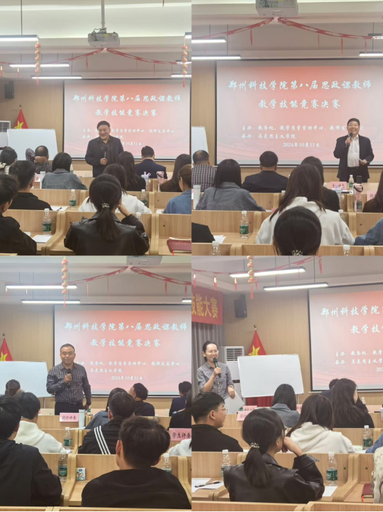 10月11日,郑州科技学院第八届思政课教师教学技能大赛在科教东楼101室举行。本次比赛由教师发展中心、教务处、教学质量管理中心主办,马克思主义学院承办。河南工业大学马克思主义学院院长李海涛教授、河南财经政法大学科研发展部部长田训龙教授、郑州大学马克思主义学院程明欣教授、河南农业大学马克思主义学院习近平新时代中国特色社会主义思想概论教研部主任刘宁静副教授和郑州科技学院周景伟副教授、王自寻副教授、李帅卫副教授担任专家评委,7位思政课骨干教师担任同行评委,11位学生担任学生评委。全体思政课教师和部分学生现场观摩比赛。