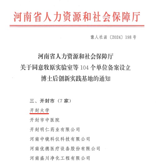 近日,河南省人力资源和社会保障厅公布了2024年度备案设立博士后创新实践基地单位名单,开封大学成功入选,这是开封大学高层次人才载体建设取得的又一突破。此次设立博士后创新实践基地,将为学校推进自主创新、加强校企合作、引进和培养高层次人才,提供重要人才和创新平台。