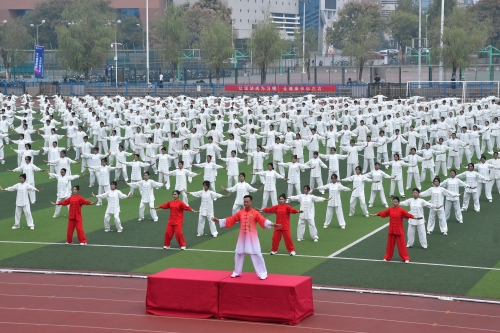 在八段锦千人展演中,同学们身着统一服装,跟随《我的祖国》背景音乐,一招一式整齐划一,精神状态自信饱满,将八段锦柔和缓慢、圆活连贯的特点表现得淋漓尽致,充分展现了南师学子传承弘扬优秀传统文化的主动性和献礼祖国盛世华诞的自觉性。