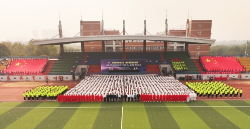 为弘扬中华优秀传统文化,庆祝新中国成立75周年,10月16日下午,南阳师范学院在中区田径场举行2024年健身气功·八段锦千人展演暨竞赛活动。校党委书记张宝锋,校党委副书记孟静雅,校纪委书记、监察专员刘守勇,副校长刘红林出席。党委办公室、党委组织部、党委宣传部、院长办公室、教务处、学生处、校团委等职能部门及体育学院负责人,各二级学院参演参赛队员,留学生代表,共计1000多名师生参加活动。活动由刘红林主持。