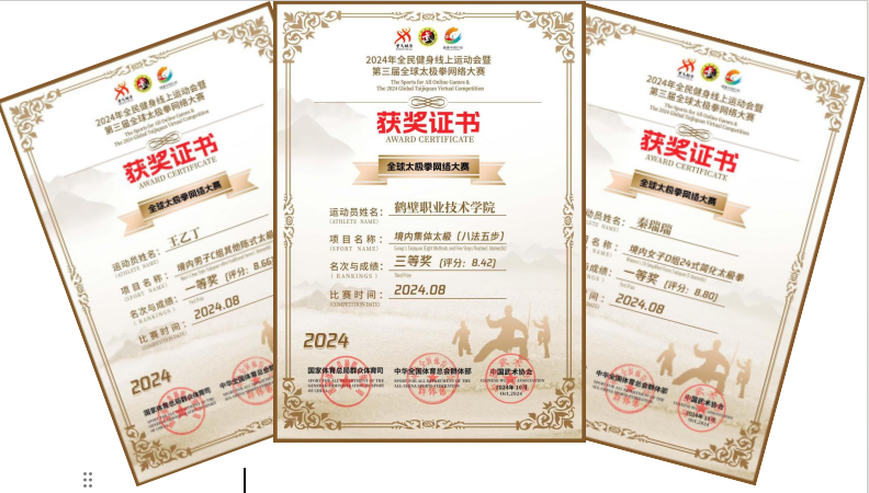 鹤壁职业技术学院共派出秦瑞瑞、夏璐、王乙丁、刘博宇、郝甜甜、鲁慧莹、龚晓涵7名选手参加本次大赛,凭借扎实的武术基础和出色表现,该校斩获一等奖2项、二等奖5项和三等奖6项,并在境内集体太极(八法五步)中获得三等奖。