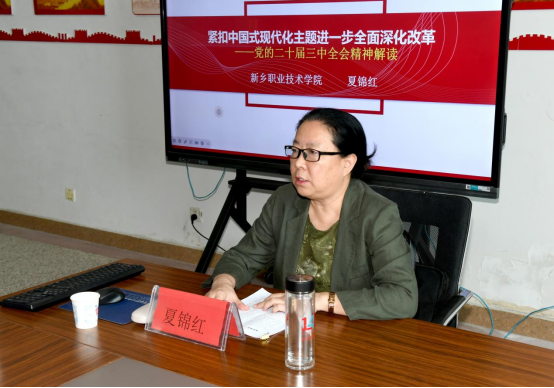 为深入学习贯彻党的二十届三中全会精神,10月18日上午,新乡职业技术学院校长夏锦红在综合楼建筑学院党员活动室,为建筑学院、财经学院、院长办公室党员开展以《紧扣中国式现代化主题进一步全面深化改革》为题的专题党课。