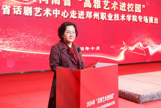 党委书记吕村代表全校师生对河南话剧艺术中心各位艺术家的到来,表示热烈的欢迎和诚挚的感谢!吕书记在讲话中指出,习近平总书记在文艺工作座谈会上的重要讲话中深刻阐明文化、文艺对一个民族、对人类文明发展进步的重大作用、深远影响。郑州职业技术学院自2012年以来坚持将“高雅艺术进校园”作为开展大学生素质教育的重要载体,引领师生“走进艺术、聆听经典、陶冶情操、提高素养”,形成充满活力、多方协作、开放多元的学校美育新格局,有力引领了高质量校园文化的发展。她强调,当前,郑州职业技术学院正处在爬坡过坎、努力升本的建设中,需要我们鼓足十分干劲。今天,我们重温焦裕禄这位人民公仆感人至深的事迹,不仅是一场文化艺术的盛宴,更是一堂思想政治课,一堂形式特殊的党课,希望大家要认真感悟话剧《焦裕禄》带来的深刻意义,从中汲取力量,传承伟大精神,进一步激发自身的紧迫感、责任感和使命感,勇担时代使命,砥砺实干奋进,奋力书写郑州职业技术学院职业教育高质量发展的新篇章。