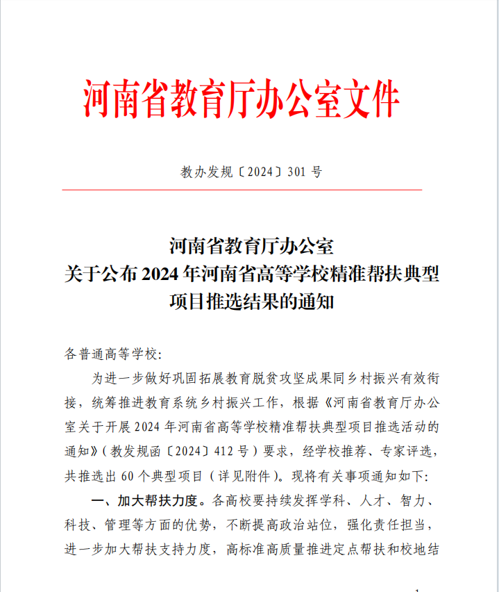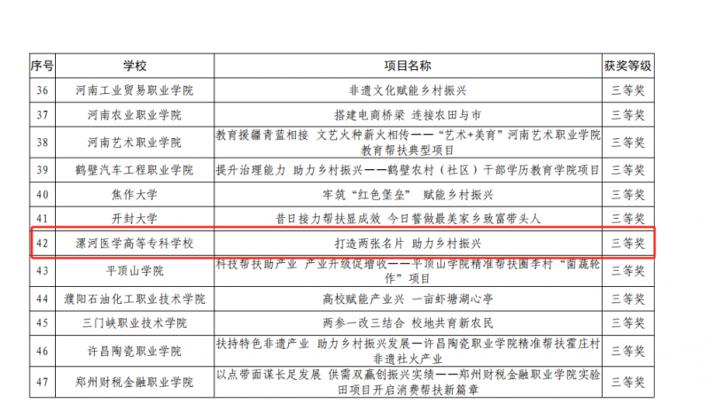 近日,河南省教育厅办公室公布了河南省2024年高等学校精准帮扶典型项目评选结果,漯河医学高等专科学校推荐的《打造两张名片 助力乡村振兴》项目成功入选河南省高等学校精准帮扶典型项目,并荣获三等奖。