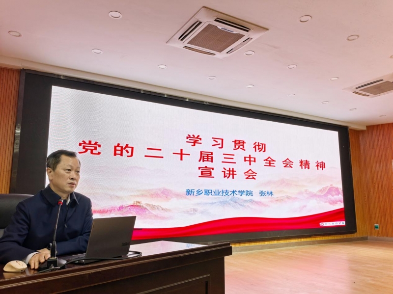 为深入贯彻落实党的二十届三中全会精神,推动领悟全会就进一步全面深化改革、推进中国式现代化作出的战略部署,10月23日下午,新乡职业技术学院党委书记张林为马克思主义学院、智能制造学院的全体师生党员以《学习贯彻党的二十届三中全会精神》为题上党课。
