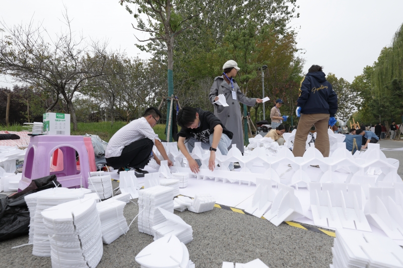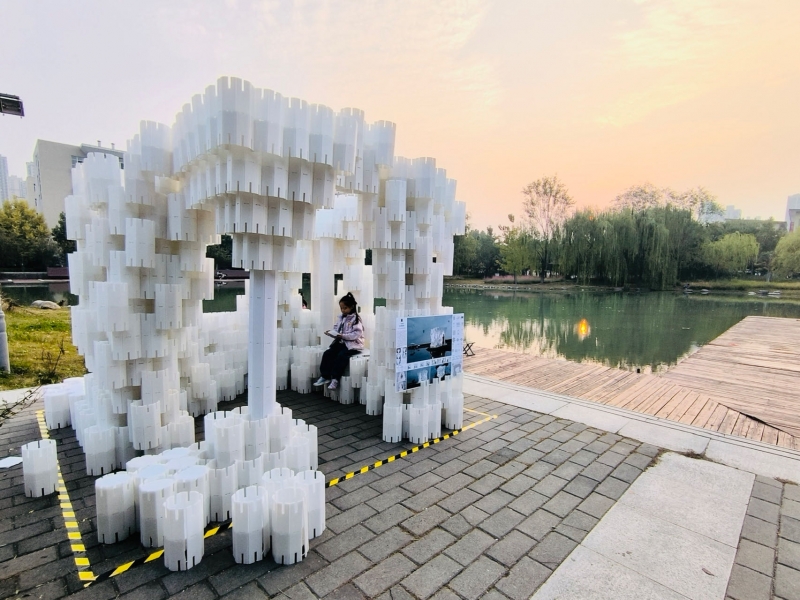 本次比赛以粮食仓储建筑“筒·藏”为设计主题,以白色中空塑料板为材料,进行形式构思及空间搭建,为河南工业大学中心景观湖畔沿岸设计并搭建一组师生休息场所。希望通过比赛激发同学们对中国粮食文化的兴趣和热爱,从而保护好、传承好、弘扬好博大精深的中国粮食文化。