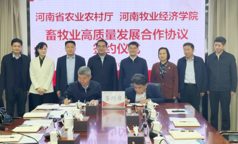 10月28日,河南省农业农村厅、河南牧业经济学院举行推动畜牧业高质量发展合作协议签约仪式在河南牧业经济学院举行。省委农办主任,省农业农村厅党组书记、厅长孙巍峰,河南牧业经济学院党委书记刘志伟、校长尹新明出席签约仪式。省农业农村厅党组成员、副厅长刘晓文,河南牧业经济学院副校长杨国宇,代表双方签署协议。尹新明主持签约仪式。