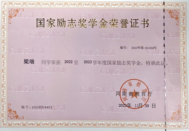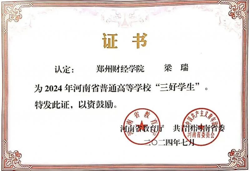 梁瑞,郑州财经学院智能工程学院2021级智能制造工程本科1班学生,中共预备党员。踏入大学校门后,他严谨踏实,乐知好学,三年来学习成绩一直稳居专业前三,综合成绩连续第一。曾公开3项发明专利,在教育部主管刊物、SCI二区发表学术论文2篇,先后荣获“国家励志奖学金”“河南省三好学生”“郑州市三好学生”等国家级、省市级荣誉9项。今年10月,荣获“国家奖学金”。