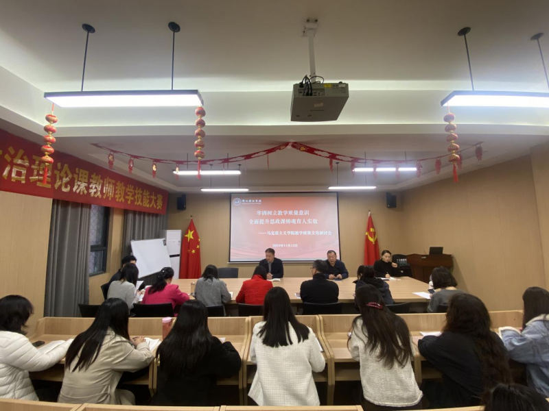 为进一步落实2024年度教学质量文化月各项活动部署,牢固树立教学质量意识,有效提升思政课铸魂育人实效,11月12日,郑州科技学院马克思主义学院召开题为“牢固树立教学质量意识,切实提升思政课铸魂育人实效”的教学质量文化研讨会,会议由副院长马家生主持,各教研室主任、督导组成员及教师代表参加。