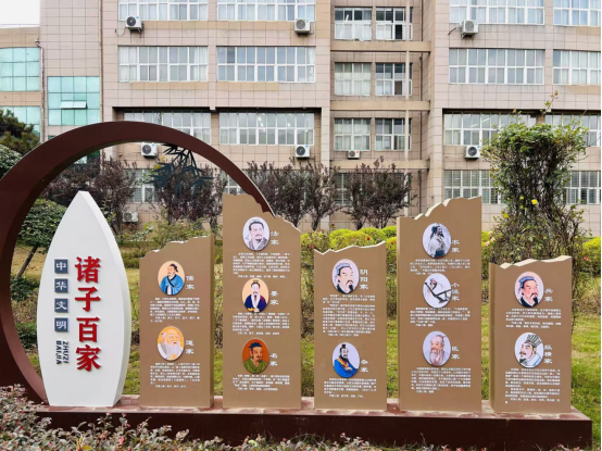 穿行园子,内心不由自主地便会安静下来。在错落有致的植被中,极具中国传统文化特色的诸子百家、二十四节气、中国传统节日、剪纸、刺绣、中医、国画等标识立牌散布其中,搭配含有现代设计观念的元素,将中国传统文化以图文并茂的形式,进行了生动展现,师生在寓教于乐中坚定文化自信、陶冶文化情操、提升品格修养。
