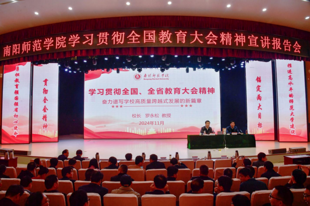 为深入学习贯彻党的二十届三中全会精神,全面贯彻落实全国、全省教育大会精神,11月15日上午,南阳师范学院校长罗永松在音乐厅为全校领导干部作全国、全省教育大会精神集中宣讲。全体校领导、全体处级干部和全体学工队伍参加会议。宣讲会由校党委书记张宝锋主持。
